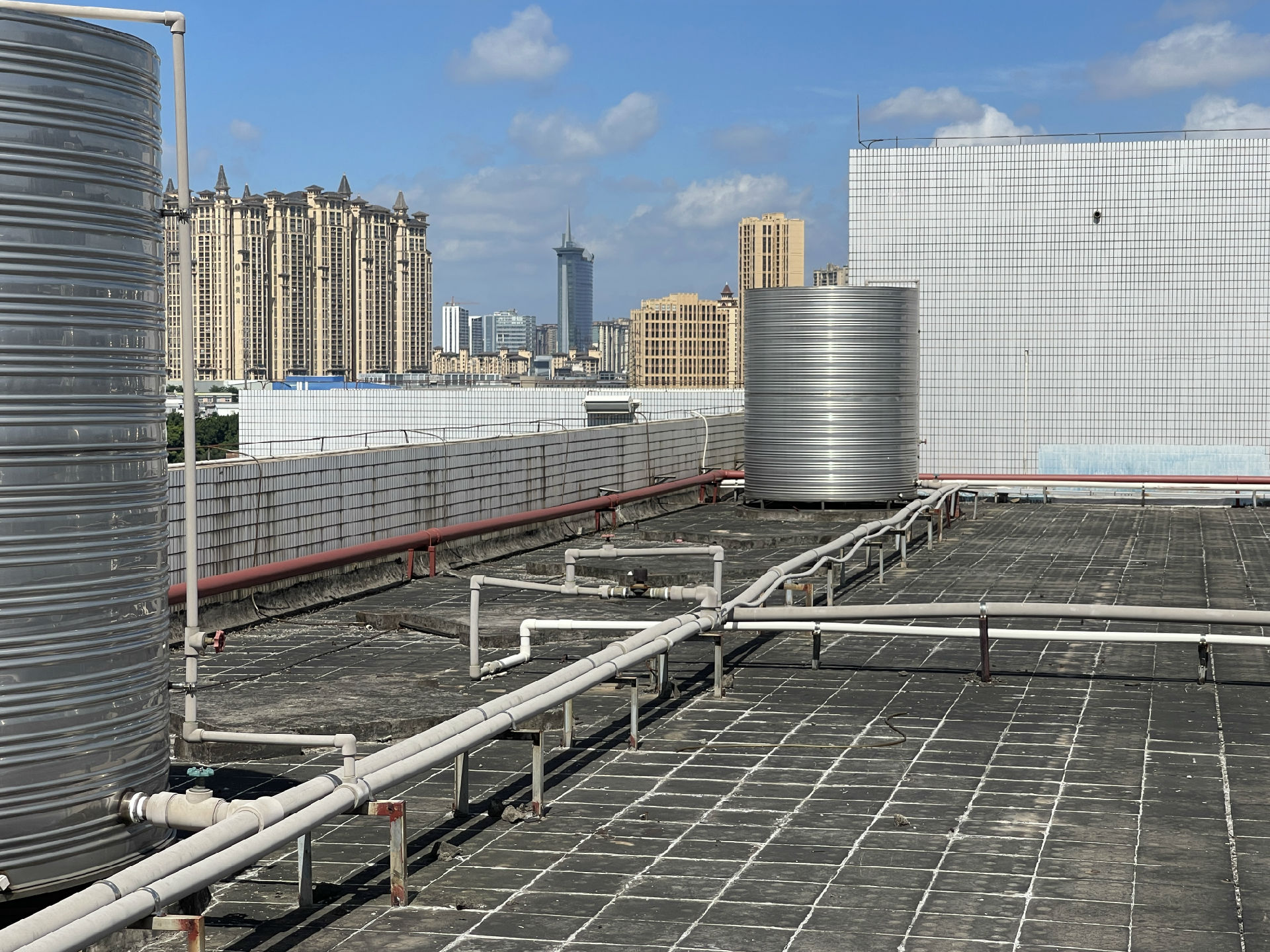 Guifeng Middle School hot water renovation project, Juteng plans to install 7 units of 10 hp stainless steel air source water heaters and 7 units stainless steel water tanks in one dormitory building, which can increase the capacity of hot water by 35 tons, guarantee the hot water life of 1524 students in the dormitory at all-weather constant temperature and comfort.