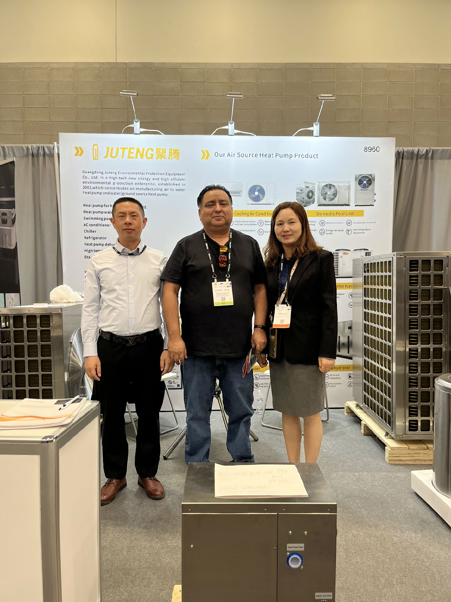 聚腾空气能在本次展会中展示了多款旗下空气能明星产品,以及变频恒温泳池热泵新品,收获北美地区客户的海量好评,并对产品的使用体验、发展方向进行了深入的交流。